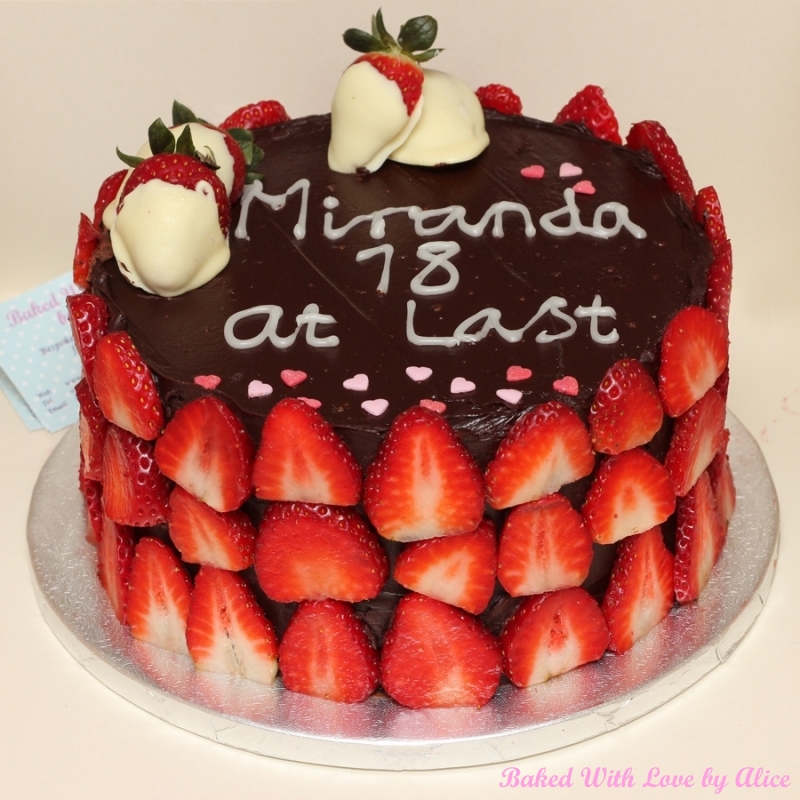 This rich Belgian chocolate birthday cake was filled with chocolate butter cream, covered in a Belgian chocolate ganache and edged with strawberries.