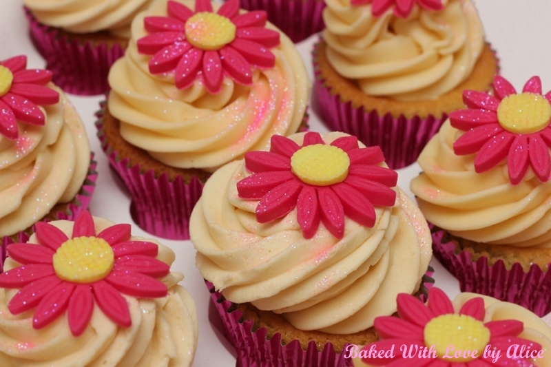 This quirky 18th birthday celebration cake was delivered this weekend. The order consisted of 40 daisy topped vanilla cupcakes and an 8″ vanilla sponge filled with jam and butter cream and decorated to match the cupcakes. A funky edible cake topper completes this cake.