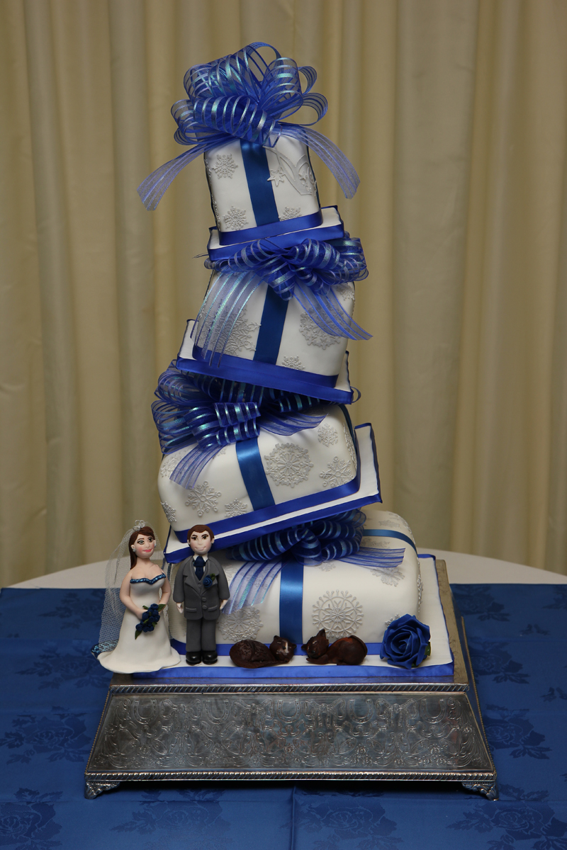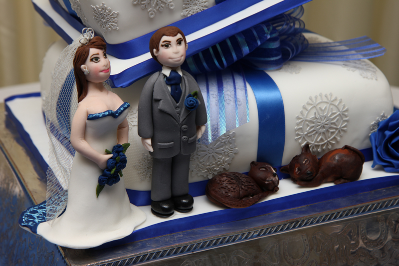 A four tier topsy turvy wedding cake with hand made Bride and Groom and cat figures which was delivered and assembled at The Batch Country House, Somerset.